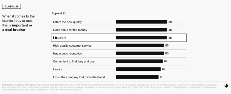By contrast, trust is a purchasing shortcut. Edelman’s 2025 brand trust reporting argues that trust now competes alongside price and quality as a decisive purchase consideration—meaning it’s not a “nice to have,” it’s a core differentiator.