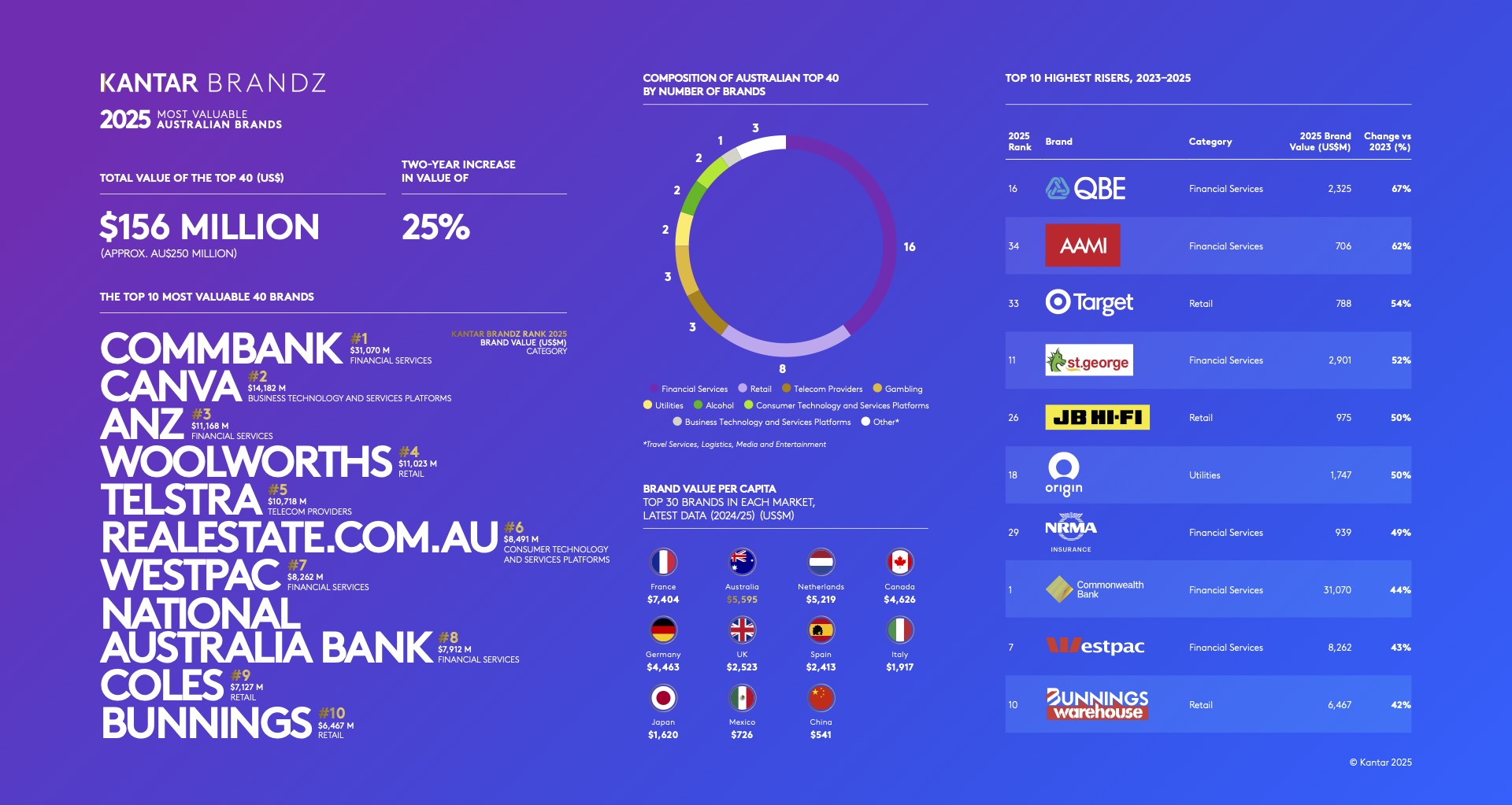 The combined value of Australia’s top 40 brands, according to The Kantar BrandZ Top 40 Most Valuable Australian Brands Report, is worth US$156 billion in 2025 (up 25% since 2023). Just 18% of brand value from the top 40 brands comes from international markets, indicating strong domestic reliance.
