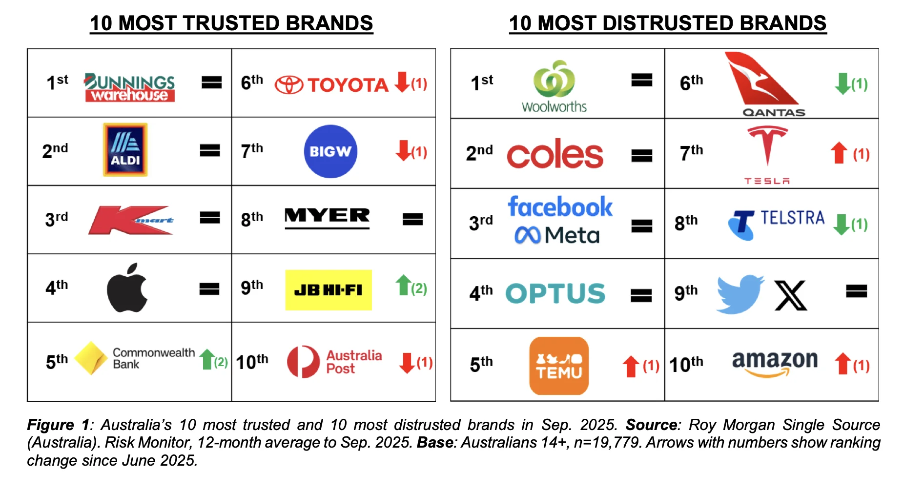 In Australia, A Roy Morgan study from the end of 2025 revealed that our top three trusted brands are Bunnings Warehouse (Retail), ALDI (Supermarket) and Kmart (Retail). On the other side of the coin, our top three most distrusted brands include one of our top valued brands, Woolworths (Supermarket), Coles (Supermarket) and META (Technology).